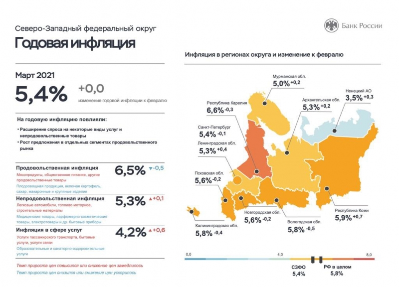 Годовая инфляция в Вологодской области в марте замедлилась до 5,8% после 6,3% в феврале. В результате ее уровень сравнялся с общероссийским, но в целом остался выше, чем по Северо-Западному федеральному округу.