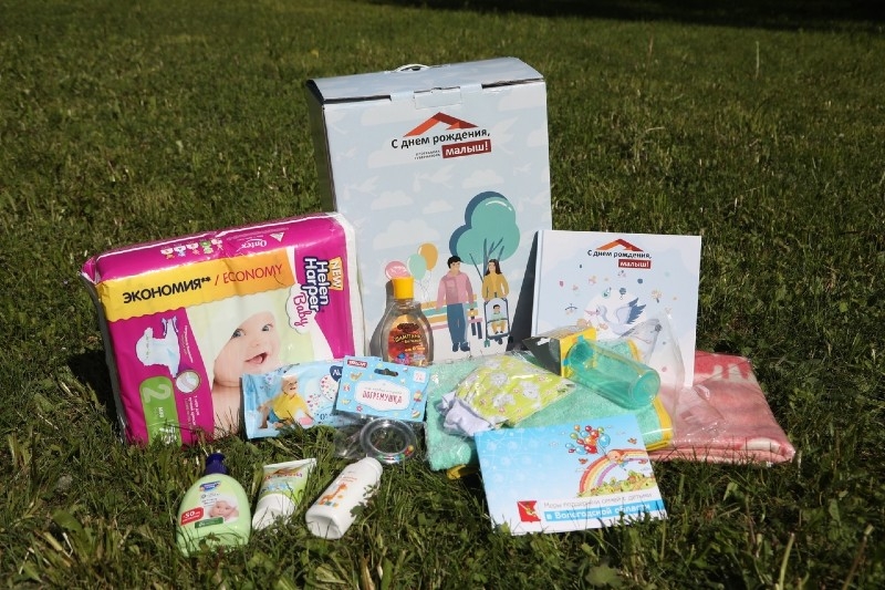 Набор получает каждая семья в день выписки прямо в роддоме. В нем все самое необходимое для первых дней жизни: одеяло, подгузники, бутылочка для кормления, альбом, игрушка.