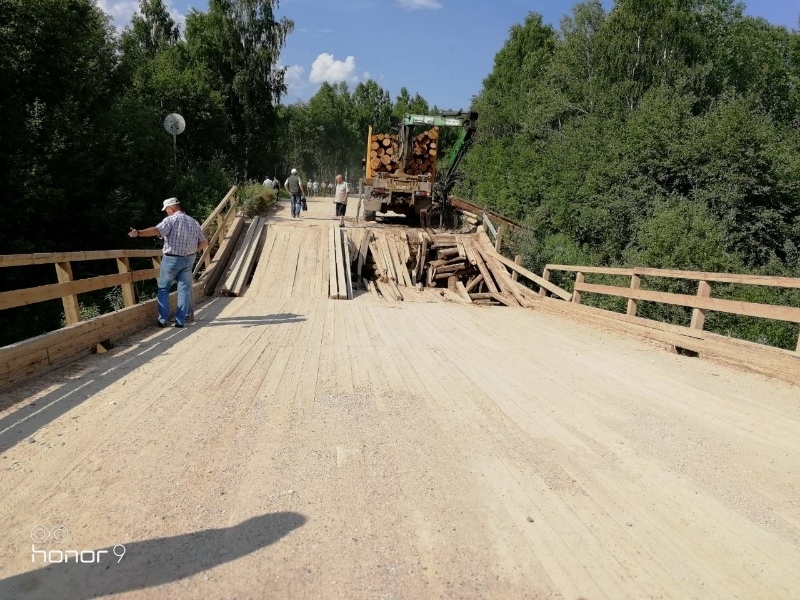 Мост через реку Пеногу обвалился после проезда грузовика в конце июня. Он соединял берега, на которых стоят деревни Слуда и Озерки. Мост имеет статус регионального, поэтому на восстановление сооружения местные власти ждали денег от области. А до этого времени для проезда была сделана временная переправа в виду насыпи и брошенной в воду трубы.