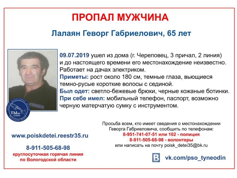 Геворг Лалаян ростом 180 сантиметров, у него темные глаза, кудрявые темно-русые волосы с сединой. Был одет в светло-бежевые брюки, черные кожаные ботинки. С собой имел мобильный телефон, паспорт, вероятно, черную матерчатую сумку с инструментом. Известно, что мужчина работает на дачах электриком.