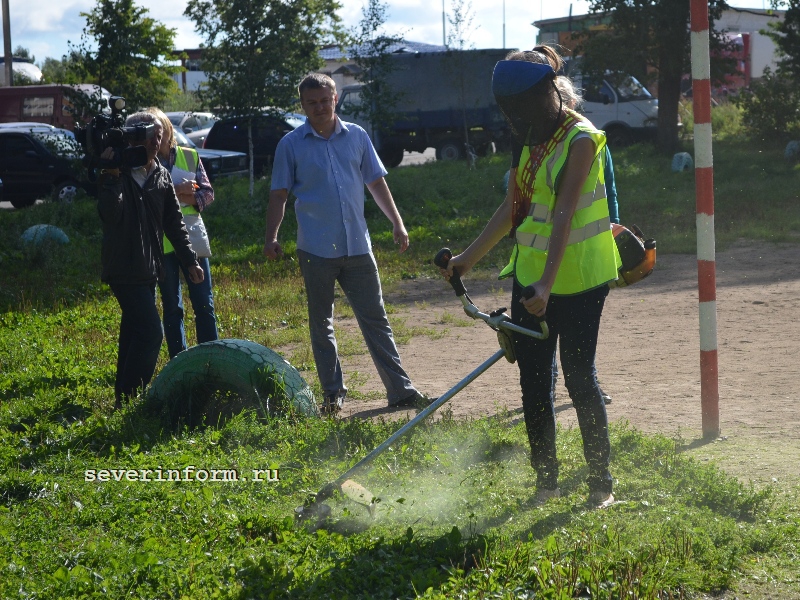Вологодские журналисты взялись за электрокосилки. Подстричь газон на школьном стадионе стало новым заданием для трудовых журналистских бригад.