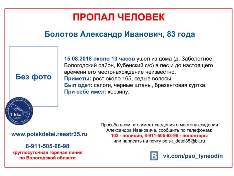 Александр Болотов исчез в деревне Заболотное Вологодского района. Он ушел в лес из своего дома накануне днем и с тех пор его никто не видел.