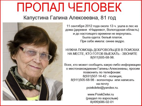 Как рассказали корреспонденту агентства в поисковом отряде «Ты не один», Галина Алексеевна Капустина ушла из деревни Надеево Вологодского района. При себе пожилая женщина имела синее ведро, на голове был завязан белый платок.