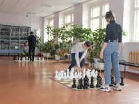 Руководство лицея задалось вопросом: зачем тогда школа, если всё можно найти в интернете? Чтобы дети не разучились думать, в фойе поставили ростовые шахматы. Сейчас проводятся даже командные игры. Планируется поставить ростовые шашки, нарды, нарисовать классики, установить теннисный стол.