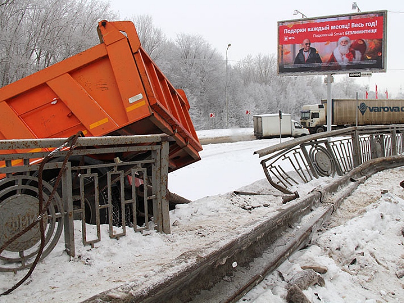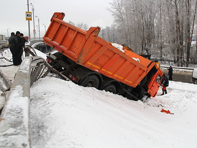 По предварительным данным, груженный снегом «КамАЗ» выезжал на путепровод со стороны Ясной Поляны. Через несколько десятков метров после поворота водитель не справился с управлением, грузовик пробил ограждение и скатился вниз к проезжей части.
