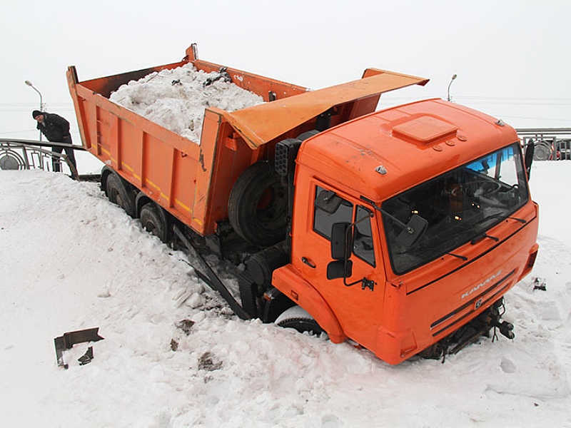 В Череповце грузовик со снегом слетел с дороги. ДТП случилось 16 декабря около 11:00 на путепроводе у мясокомбината.