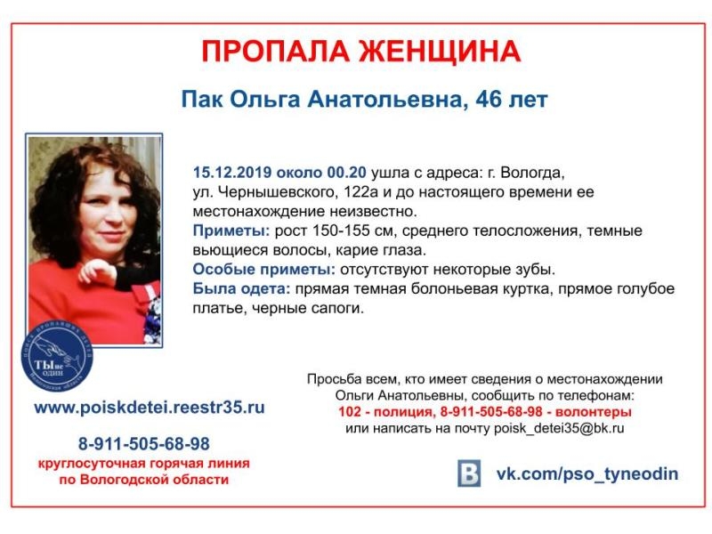 Передать информацию о местонахождении Ольги Анатольевны можно в полицию или волонтерам по номеру 89115056898, сообщает ИА «СеверИнформ».