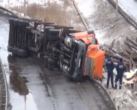 Лесовоз ехал по направлению к Архангельску. По какой-то причине водитель не справился с управлением, и машину занесло. После этого лесовоз опрокинулся, а бревна рассыпались .