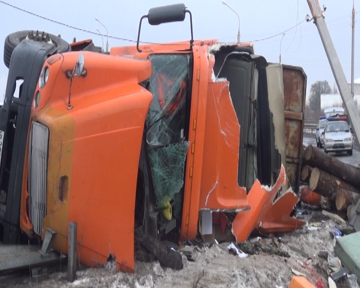Под Вологдой перевернулся груженый лесовоз. Водителя зажало в кабине. Авария произошла в понедельник, 17 февраля, в 15:30 на автодороге обхода города Вологды.