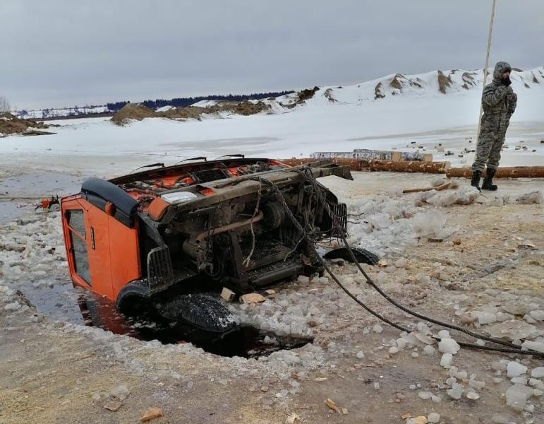 Напомним, КАМАЗ, перевозивший песок, провалился под лед на переправе через Северную Двину 14 февраля. Из людей никто не пострадал: водитель успел покинуть кабину до того, как техника ушла под воду. Многотонная машина погрузилась в реку почти полностью, на водой виднеется лишь часть кабины.