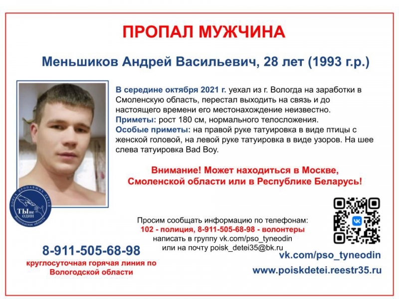 28-летний Андрей Меньшиков отправился в Смоленскую область еще в октябре прошлого года. Потом перестал выходить на связь, и до сих пор местонахождение мужчины не установлено. Вероятно, находится в Москве, Смоленской области или Беларуси. Поисками занимаются полицейские и волонтеры.