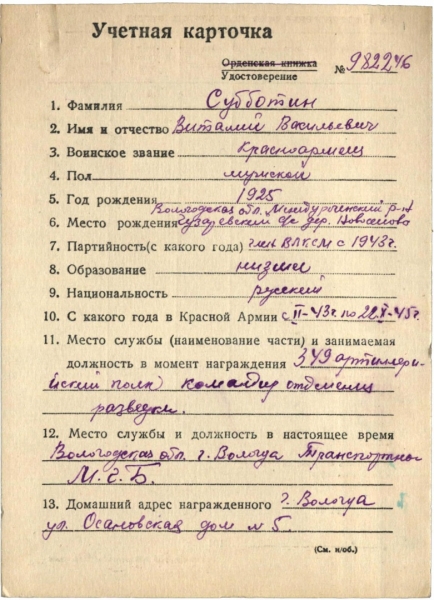 После того, как была сделана находка, удалось установить личность владельца. Субботин Виталий Васильевич 1925 года рождения служил командиром отделения разведки 349 артполка. После войны жил в Вологде на улице Осановской в доме №5.