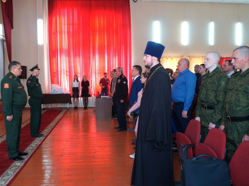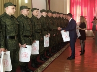 В актовом зале состоялось торжественное отправление призывников в ряды Президентского полка. Напутственные слова для них произнес замглавы региона Евгений Богомазов, военный комиссар области Алексей Зотов, протоиерей Александр Юшкин, член «Юнармии» и мама одного из новобранцев. Заместитель губернатора вручил будущим солдатам памятные подарки.