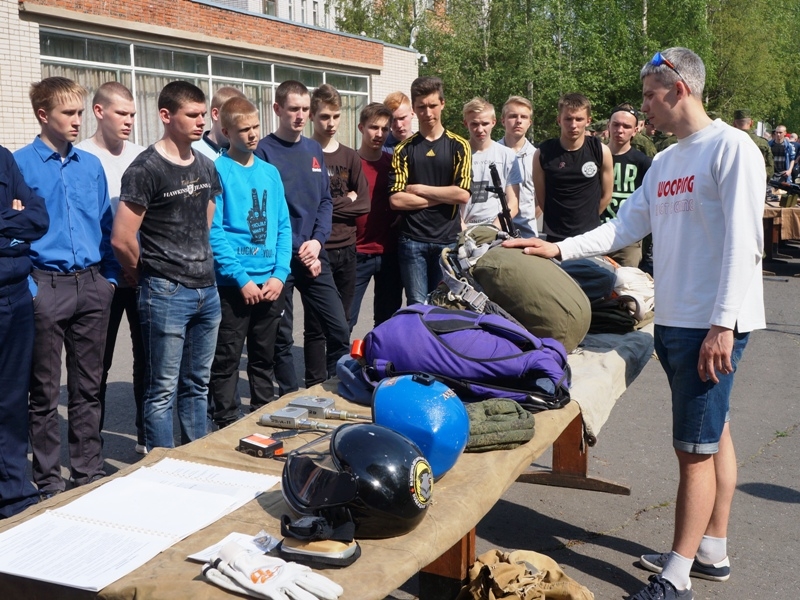Представители Вологодского аэроклуба рассказали про оснащение парашютиста и основы подготовки спортсменов. Они пригласили ребят принять участие в прыжках с парашютом.