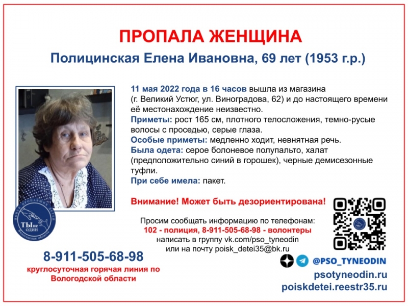 69-летняя жительница Великого Устюга потерялась еще 11 мая. Близкие женщины считают, что она могла целенаправленно пойти к реке. Последнее время у пенсионерки были какие-то переживания, пишет «Устюжаночка».