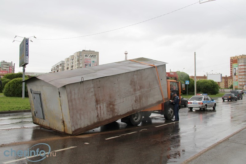 В Череповце с грузовика на проезжую часть упал гараж. Это случилось во время движения транспортного средства. Инцидент произошел во вторник, 17 июня, около 13 часов, на пересечении Октябрьского и Шекснинского проспектов.