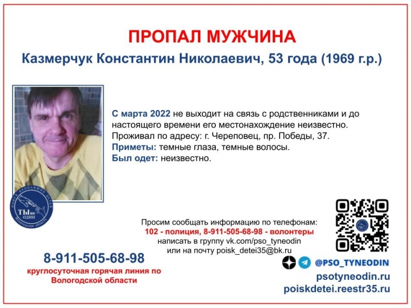 53-летний Константин Казмерчук на протяжении нескольких месяцев не выходит на связь с родственниками. ПСО «Ты не один» обращается за информационной поддержкой поиска.