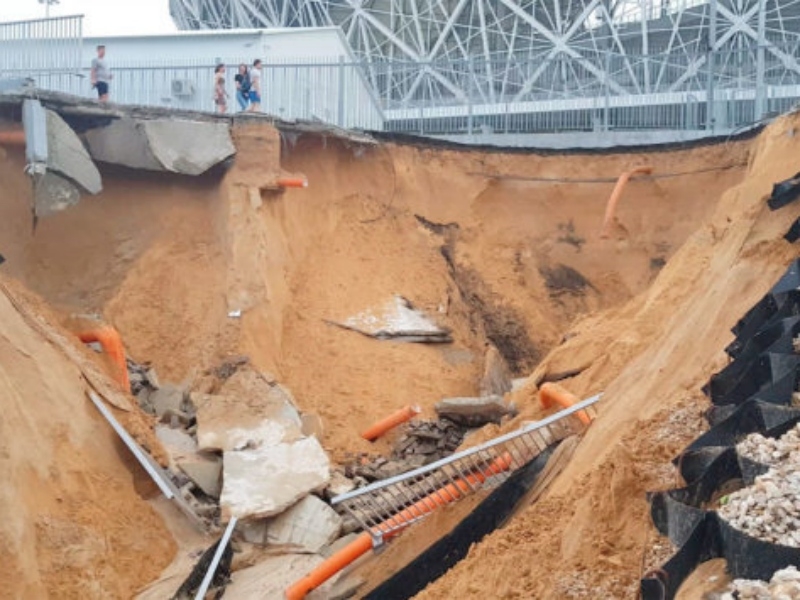 Началось все с Нижнего Новгорода. Как только в городе закончились последние матчи, в городе прошел ливень, который в буквальном смысле смыл набережную, построенную к спортивному событию. Брусчатка была уложена прямо на песок, и сильный дождь ее размыл. Стоимость объекта — 768 миллионов рублей. Власти Нижнего объяснили разрушение Волжской набережной «экстремальным количеством осадков».