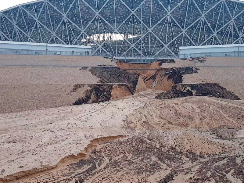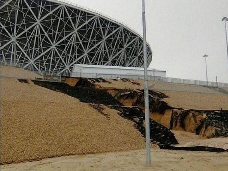 С подобной бедой столкнулся и Волгоград. В воскресенье, в день финала чемпионата мира по футболу, здесь тоже прошел сильный ливень – выпала треть месячной нормы осадков. В результате был разрушен насыпной склон у стадиона "Волгоград Арена". Местные СМИ сообщают, что внутри стадион также не обошёлся без повреждений. Он обесточен, внутренние помещения залиты водой. Также не выдержала напора воды плитка: смыло часть тротуара.
