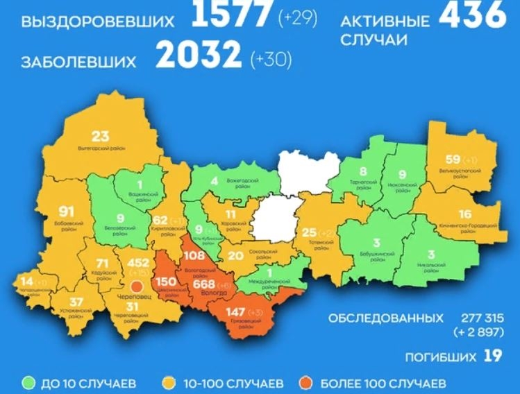 Всего с начала пандемии на Вологодчине заразились коронавирусом 2032 человека. Из них 1577 уже выздоровели, в том числе, за сутки 29. В областной столице справился с болезнью 541 человек.