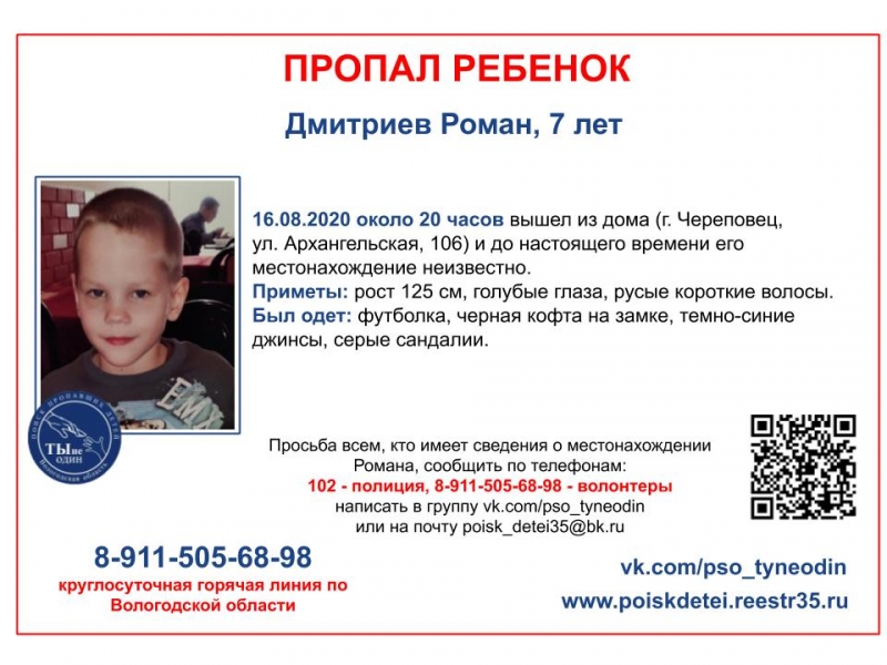 Всех, кто что-либо знает о местонахождении Ромы Дмитриева, просьба позвонить в полицию или на круглосуточную горячую линию волонтёрского поисково-спасательного движения «Ты не один» 8 911 505 68 98.