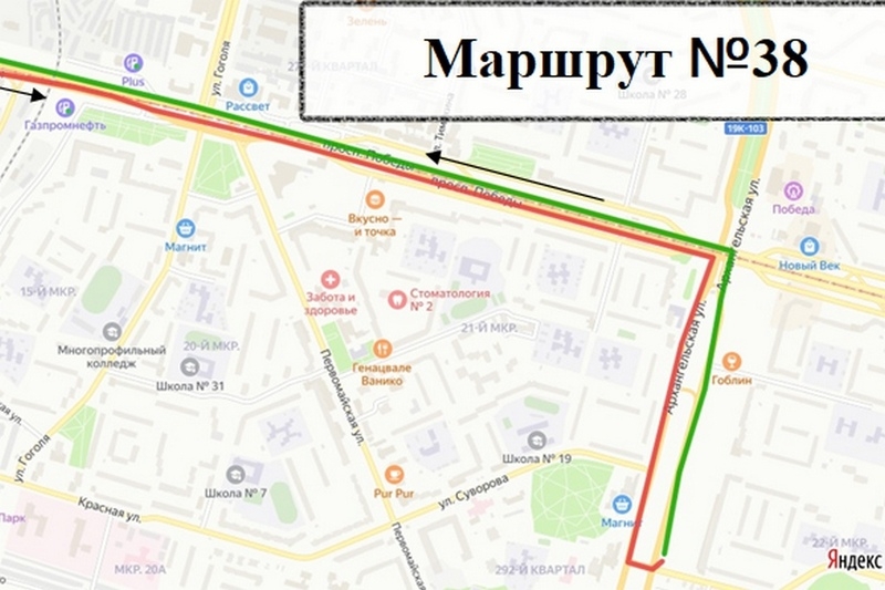 № 38 — из Индустриального района прямо по проспекту Победы до улицы Архангельской, там развернется, далее по обычному маршруту.