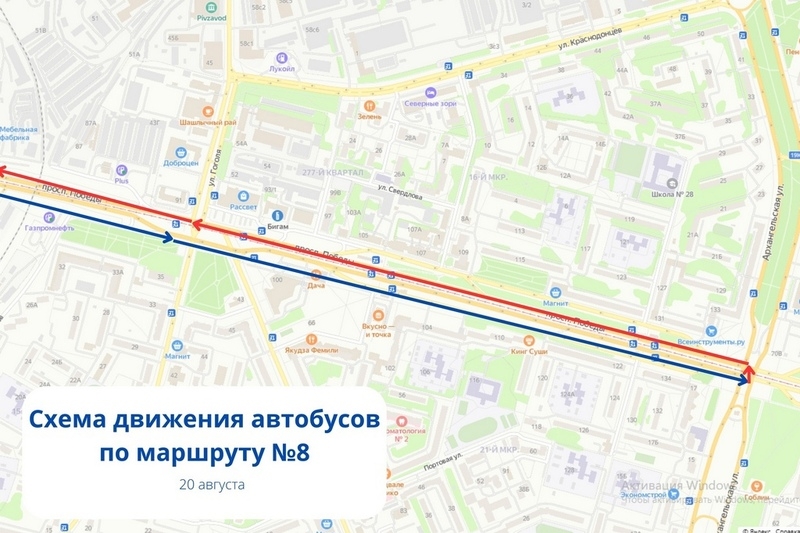 № 8 — по проспекту Победы до перекрестка с Архангельской, там развернется и обратно по маршруту в Индустриальный район;