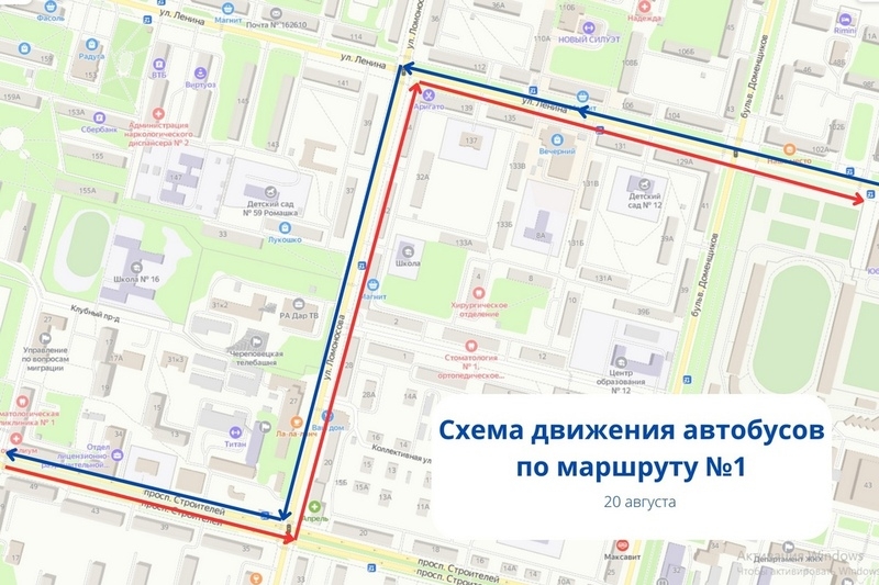 № 1 — по Ленина, свернет на Ломоносова, далее на проспект Строителей и по обычному маршруту, обратно по той же схеме;