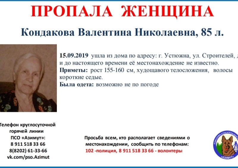 Тем, кто располагает информацией о местонахождении Валентины Николаевны, просьба обращаться в полицию по номеру 102 или в поисковый отряд 8-911-518-33-66, сообщает ИА «СеверИнформ».