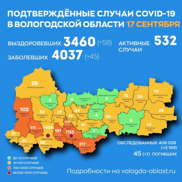 В настоящее время в Вологодской области коронавирусом болеют 532 человека. В их числе 45 вологжан, которым диагноз поставили в минувшие сутки. На этот раз много заболевших в районах: