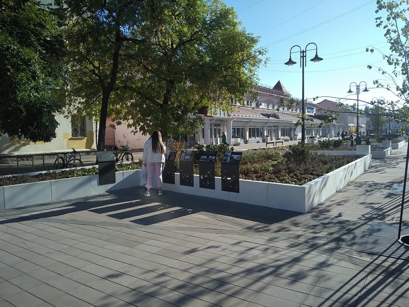 На стендах, установленных на площади, идет описание истории Большой Благовещенской улицы с историко-архитектурными справками, фотографиями. Но автор тут же замечает, что некоторые тексты не отредактированы, идут не хронологично, поэтому некоторые факты трудно воспринимаются.