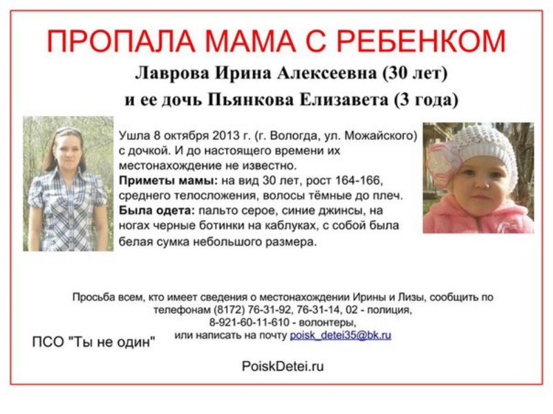 Все, кто имеет какую-нибудь информацию о местонахождении Ирины и Лизы, просьба сообщить по телефонам (8172)76-31-92, 76-31-14, 02, 8-921-601-16-10 или написать на почту poisk_detei35@bk.ru.