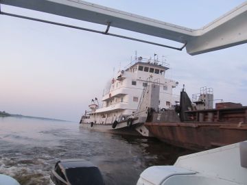 Баржа с буксиром и сухогруз столкнулись в Вологодской области. Обошлось без пострадавших.