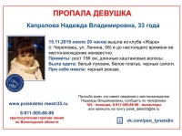 33-летнюю Надежду Капралову последний раз видели живой около ночного клуба «Жара» в ночь с 15 на 16 ноября. Теперь её разыскивают сотрудники полиции и волонтёры поисковых отрядов.