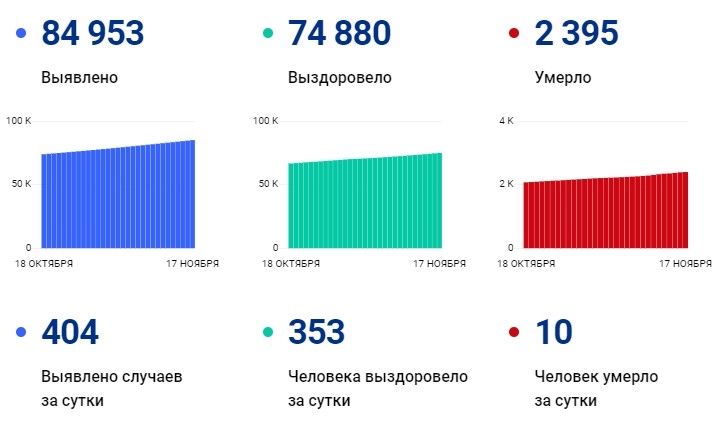 Выздоровели за сутки 353 больных – этот показатель ежедневно растет. Всего выписали 74880 пациентов. За минувшие сутки скончались 10 пациентов, всего – 2395. Такова статистика на 17 ноября, именно в этот день 2 года назад зафиксировано первый в мире случай коронавируса.