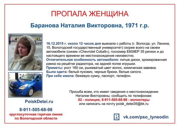 Всем, кто обладает какой-либо информацией о Наталии Барановой, можно позвонить по телефонам, указанным тут.