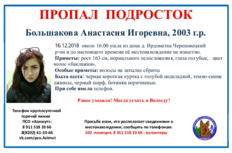 Пропавшую под Череповцом несовершеннолетнюю девушку ищут в Вологодской области. По информации поисково-спасательного отряда «Азимут», 15-летняя Анастасия Большакова ушла из дома в деревне Ирдоматка около 16 часов вчера, 16 декабря. С этого момента сведений о ней нет, предположительно школьница направилась в Вологду. Раньше она уже убегала из дома.