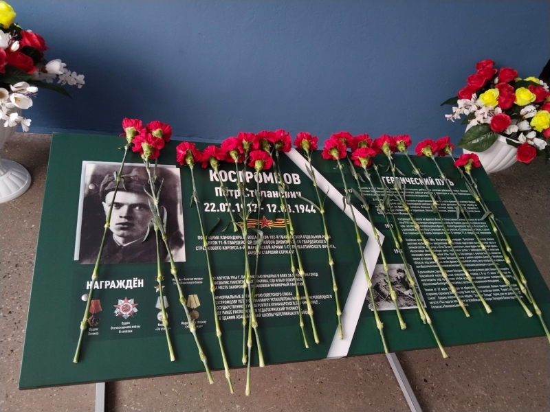 "В 1939 году Петра Степановича призвали в ряды Красной Армии. Его часть принимала участие в боевых действиях во время советско-финляндской кампании. Еще не успев дослужить срочную службу, он вновь оказался на фронте — началась Великая Отечественная война. Костромцов сражался с фашистами под Сталинградом и Харьковым, Полтавой и Невелем, освобождал от оккупантов земли Западной Украины и Белоруссии. Указом от 22 июля 1944 года за образцовое выполнение боевых заданий гвардии старшему сержанту Костромцову было присвоено почётное звание "Герой Советского Союза". Однако получить свою медаль "Золотая Звезда" герою уже не довелось: 12 августа 1944 года он пал в боях за освобождение Северо-Западной Литвы под городом Пасвалис в Паневежском районе", - рассказал глава Череповецкого района Роман Маслов.