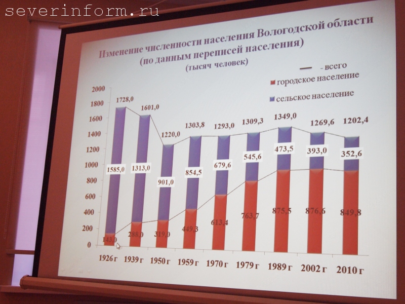 «Мы видим, что по переписи 1926 года в области насчитывалось 1 миллион 728 тысяч человек, значительную долю представляло сельское население, - рассказал руководитель Вологдастата Анатолий Лысов. - В 50-е годы наблюдаем сокращение численности, которое вызвано последствиями Великой Отечественной войны. Потом идет рост вплоть до конца 80-х годов. Начиная с 90-х годов, численность населения опять пошла на убыль».
