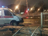 Водитель «скорой» не справился с управлением, «Газель» занесло и она врезалась в ограждение трамвайных путей. Серьезно в аварии никто не пострадал. Фельдшер, которая находилась в машине, получила ушиб колена.