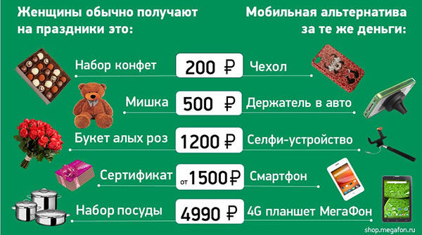 «Одеколон и конфеты – это, конечно, приятные подарки, но все больше людей хотят, чтобы презенты были еще и полезными. Об этом говорит и статистика продаж в наших салонах: перед праздниками спрос на смартфоны и планшеты под брендом «МегаФона» резко возрастает. И это неудивительно, ведь купить функциональные гаджеты или аксессуары сейчас можно по очень выгодной цене. А чтобы помочь вологжанам выбрать подарки, мы составили свой рейтинг для мужчин и женщин», – говорит руководитель по развитию бизнеса на массовом рынке компании «МегаФон» в Вологде Алла Лебедева.