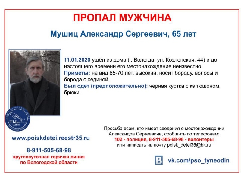 Александр Мушиц высокий, носит бороду, волосы и борода с сединой. Предположительно был одет в черную куртку с капюшоном и брюки. Всех, кому известно что-либо о судьбе пенсионера, просят обратиться по указанным телефонам, сообщает ИА "СеверИнформ".