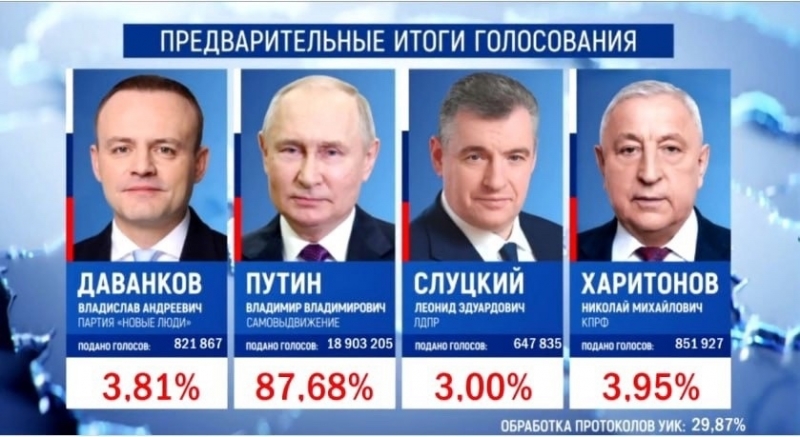 Официальные итоги выборов подводит ЦИК. К 3 часам ночи по Москве комиссия отчиталась об обработке более 90% протоколов. По этим предварительным результатам, Владимир Путин набрал 87,21% голосов, Харитонов — 4,28%, Даванков — 3,93%, а Слуцкий — 3,16%.