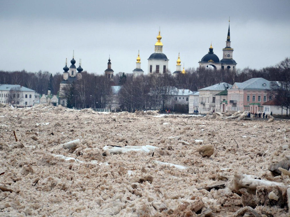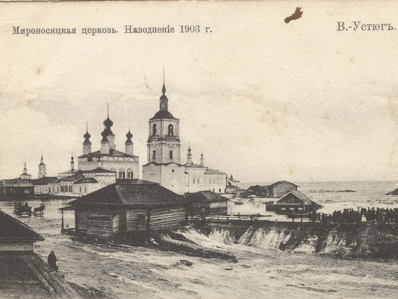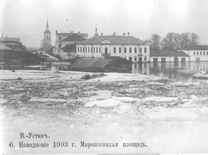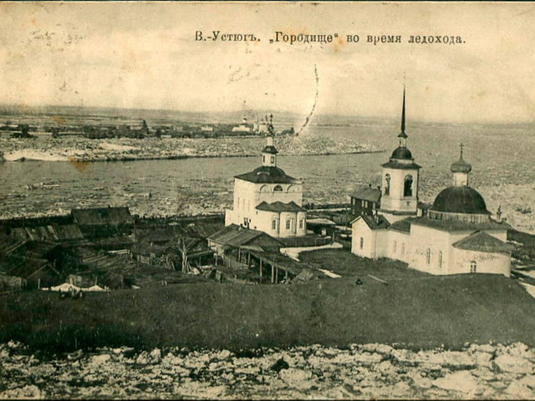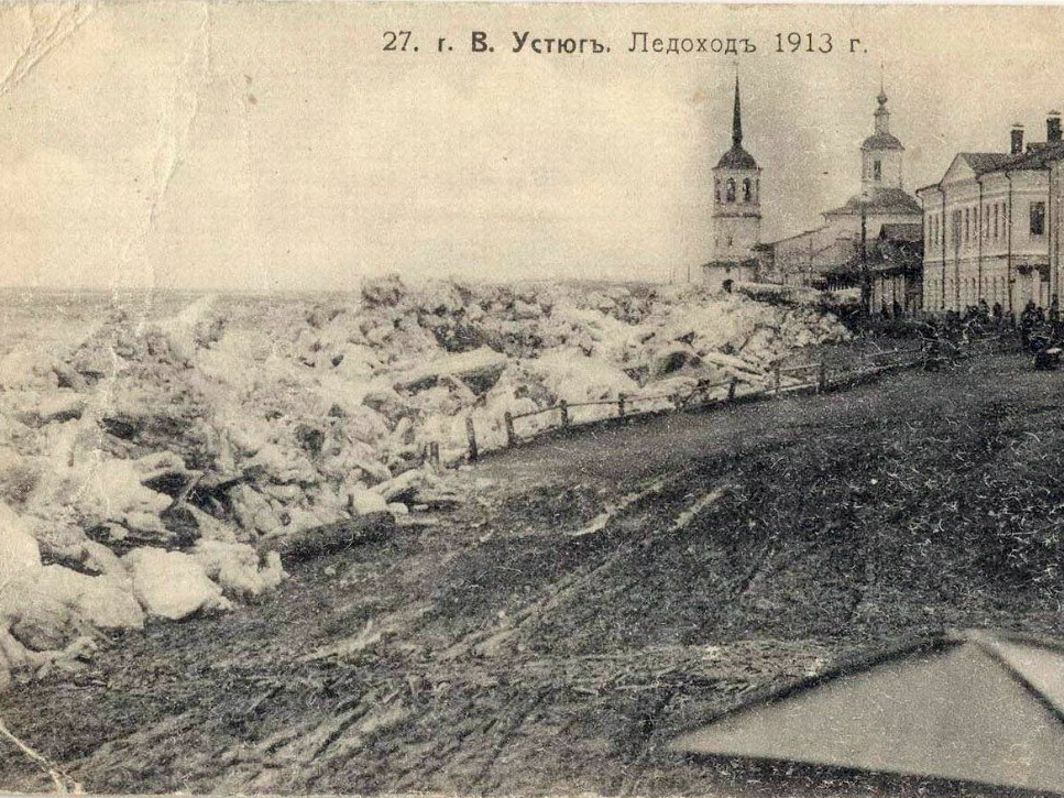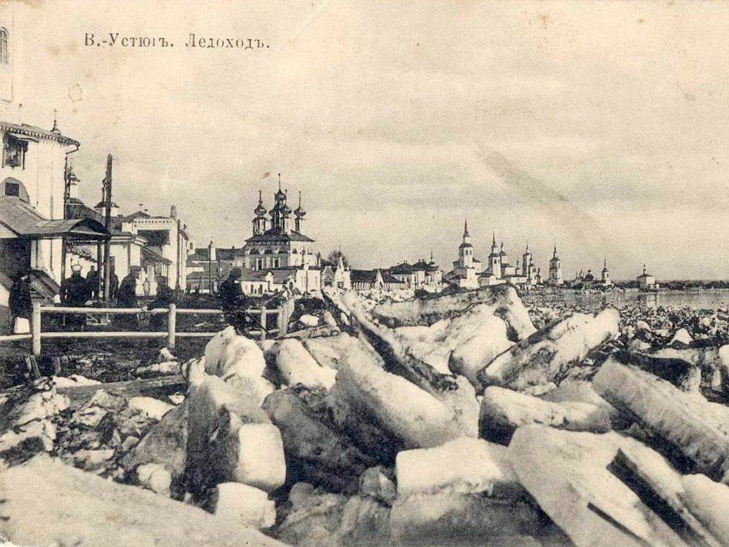 «Лед тронулся 25 апреля (по старому стилю), в половине седьмого утра и понесся так бешено, что, казалось, за льдинами по берегу не угнаться и на лошади, и к двум часам того же дня лед в Устюге прошел весь, обычно он идет несколько дней. Вода была чрезвычайно высокая, на берега нагромоздило горы льда. Береговой обруб - береговые деревянные укрепления - почти все снесло и оторвало много берега. На льдинах мимо города несло много крестьянских домов, пятистенков и мелких построек. По точному подсчету от Опок до Котласа унесло совсем 26 домов, сдвинуло и разрушило около 90. Когда Сухона очистилась ото льда, затерло лед ниже Красавина, тогда во второй части города случилось наводнение - вода пришла с Двины и все затопила...».