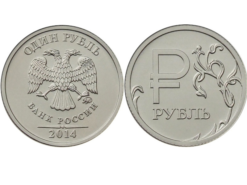 На новых монетах номиналом в один и три рубля изображен новый символ национальной валюты — буква «Р» с горизонтальной чертой. Однорублевые денежные знаки из недрагоценных металлов выпущены тиражом 100 миллионов экземпляров. На лицевой стороне монеты изображен двуглавый орел с опущенными крыльями, под ним надпись полукругом «Банк России». Вверху указан номинал «Один рубль». На оборотной стороне расположены графическое обозначение рубля в виде знака, надпись «Рубль» и стилизованный растительный орнамент в виде изогнутой ветви с переплетающимися стеблями.