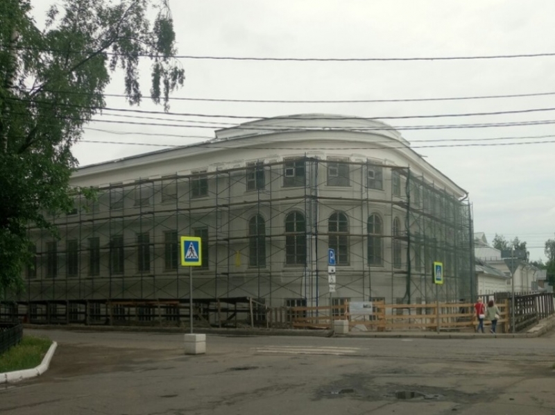 Сейчас фасад старинного здания (бывшего Дворянского собрания) окружен строительными лесами. Рабочие отштукатурят и покрасят стены, заменят окна и двери, укрепят фундамент, выполнят работы по гидроизоляции. По проекты подрядчик приведет в порядок и прилегающую территорию. Работы необходимо завершить в ноябре. Весь ход работ согласуются с представителями АУК ВО «Вологдареставрация», которые осуществляют историко-архитектурный надзор.