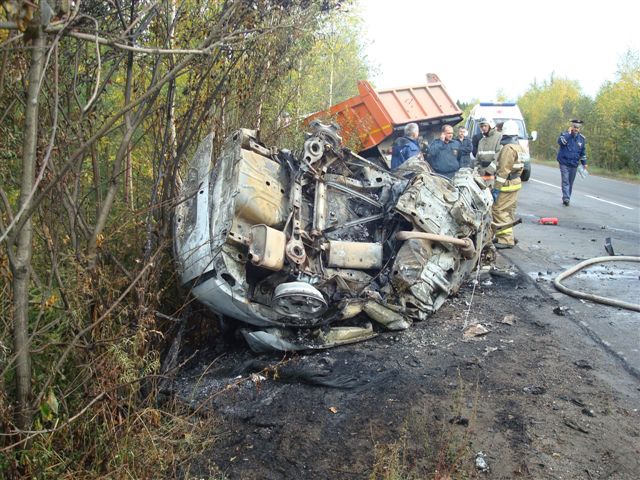 Как сообщает ИА «СеверИнформ» со ссылкой на пресс-службу ГУ МЧС России по Архангельской области, легковушка выехала на встречку. Водитель большегруза как мог уходил от столкновения, но иномарка все же ударилась водительской стороной в левое колесо и перевернулась. Груженый асфальтом самосвал улетел в кювет. У легкового автомобиля от удара пробило бензобак, и машина вспыхнула.