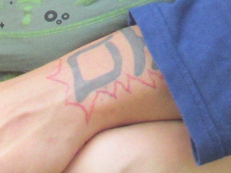 На вид подозреваемому 35-40 лет, рост 185 сантиметров, спортивное телосложения, волосы тёмно-русые, имеются лобно-височные залысины. На левой руке у запястья видна татуировка синего и красного цветов в виде иероглифов. Одет в свитер тёмно-синего цвета на молнии с орнаментом белого цвета на рукавах и спине, синие джинсы, а также чёрные ботинки. Преступник физически хорошо развит, при себе имеет нож, может оказать сопротивление.