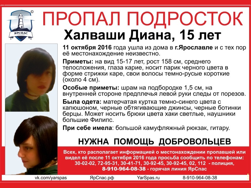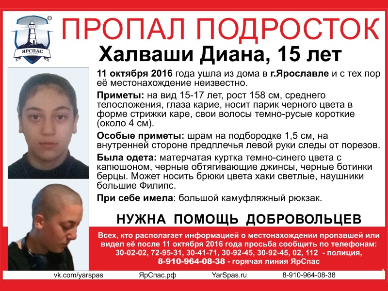 В Вологодской области может находится подросток, пропавший в Ярославле. 15-летняя Диана Халваши ушла из дома 11 октября этого года, с тех пор о ее местонахождении ничего неизвестно.
