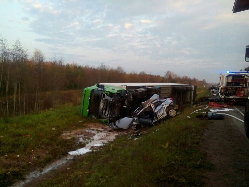 По предварительной информации, водитель Тойоты выехал на обочину, а там его развернуло на встречку, где произошло столкновение с грузовиком Скания. После столкновения фура съехала на обочину и перевернулась.
